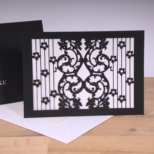 Für das Design der Hochzeitskarten im Stil Gotik haben sich die Hersteller etwas ganz Besonderes einfallen lassen: Die Karten begeistern mit feinen Verzierungen. Bei der Produktion wird eine hochwertige Lasertechnik verwendet, die optimale Ergebnisse verspricht. Der filigrane Lasercut macht es möglich, auch feine Motive genau darzustellen. Sogar die Rückseite der Dankeskarten ist mit einem Lasercut-Motiv ausgestattet. Dadurch wird die einheitliche Optik der Karten abgerundet. Das Papier, das bei der Produktion herangezogen wird, ist sehr stabil und durchgefärbt. Für die Veredelung setzen die Produzenten außerdem auf Handkonfektion.