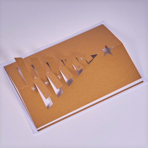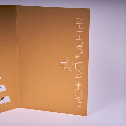 Raffiniertes Design, Lasercut in edel schimmerndes Papier, eine dezente Lasergravur auf der Innenseite der Karte - eine elegante Schönheit. Zum Aufstellen wird die Karte an der feinen Perforation in der Mitte gefalzt.