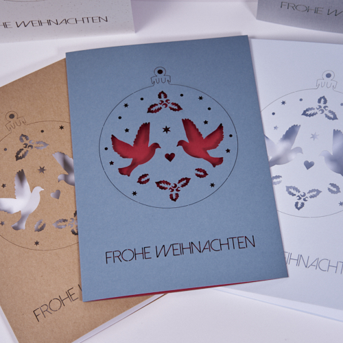 Über diese Karte freuen sich Deko-Fans ganz besonders. Die gelaserten Weihnachtskugeln können ausgebrochen werden und eignen sich hervorragend als Dekoration für Zweige, Fenster und den Weihnachtsbaum oder auch als Geschenkanhänger.