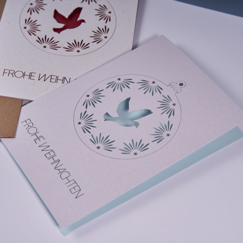 Über diese Karte freuen sich Deko-Fans ganz besonders. Die gelaserten Weihnachtskugeln können ausgebrochen werden und eignen sich hervorragend als Dekoration für Zweige, Fenster und den Weihnachtsbaum oder auch als Geschenkanhänger.
